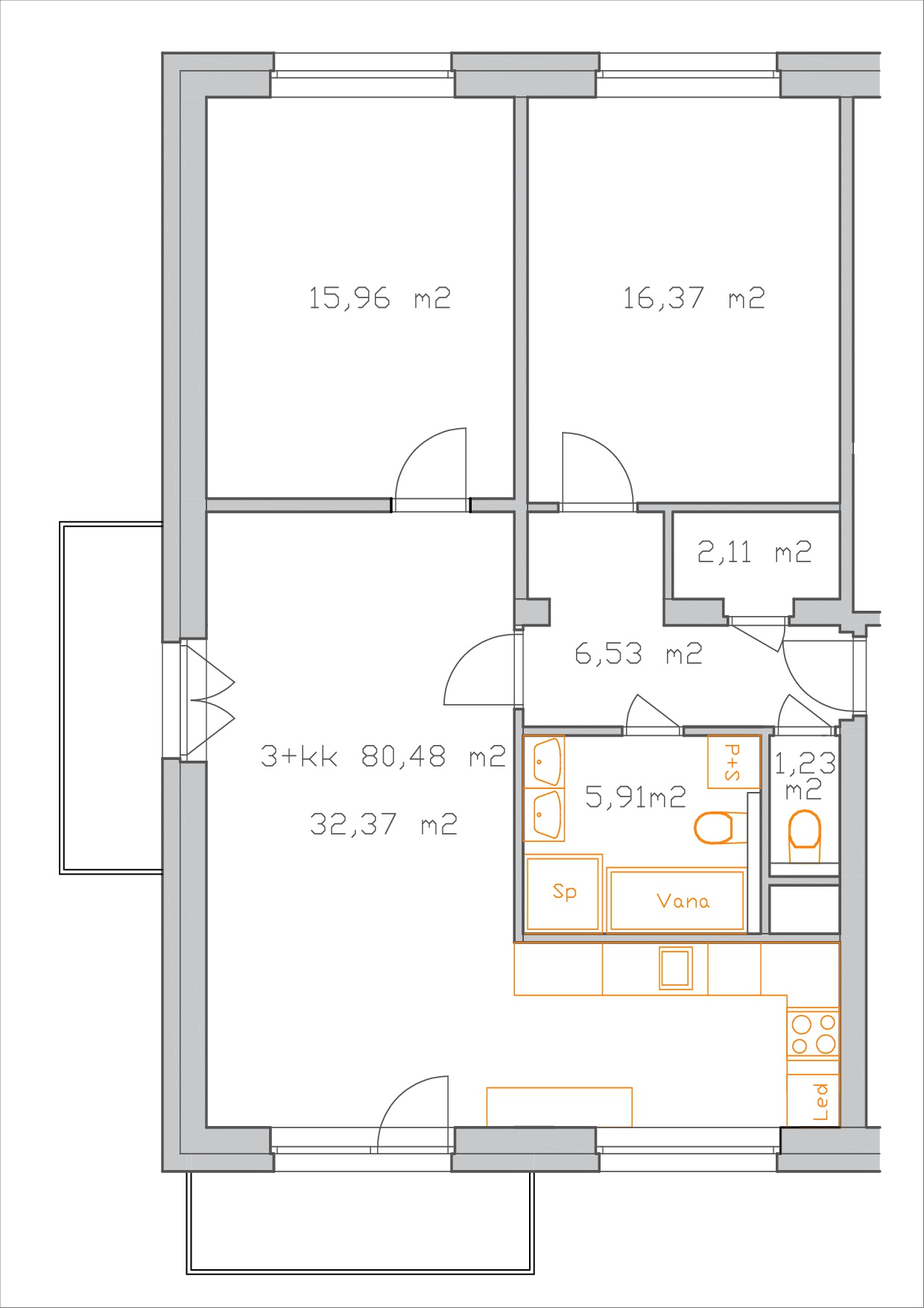Byt 3+kk s balkonem, výměra 80,48 m2 + balkon 4,68