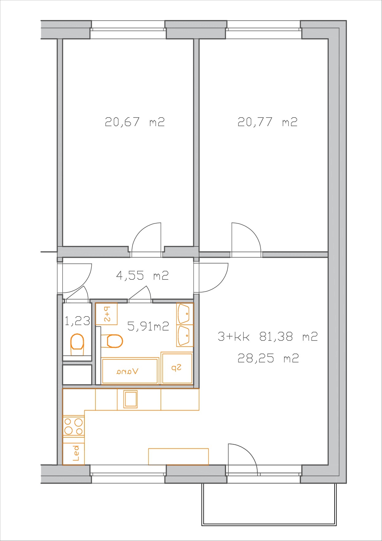 Byt 3+kk s balkonem, výměra 81,38 m2 + balkon 4,68